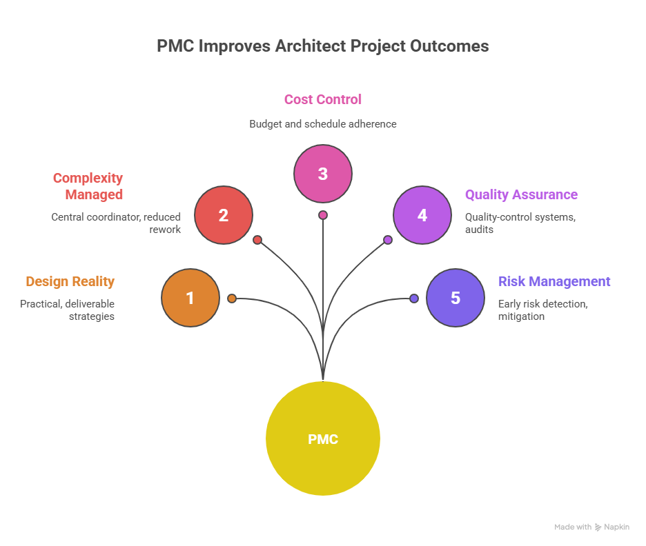 A PMC helps translate design intent into practical, deliverable strategies: procurement plans, phased hand-overs, and construction sequencing. This indicates the vision of the architect is preserved. At the same time, is also being realized efficiently.
